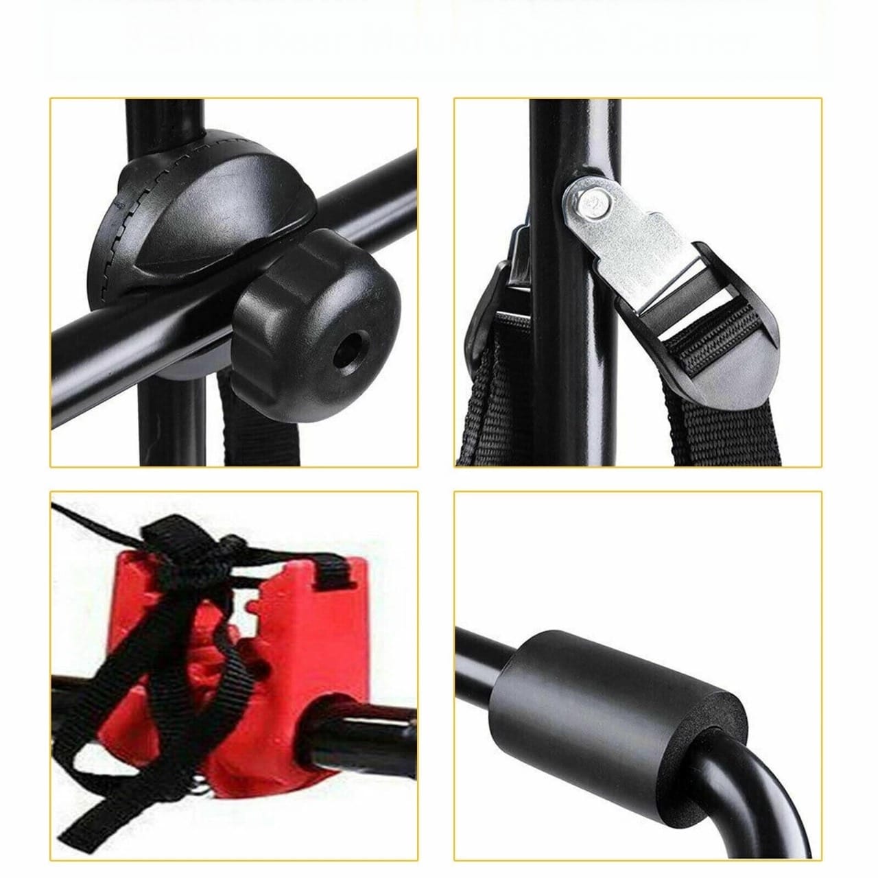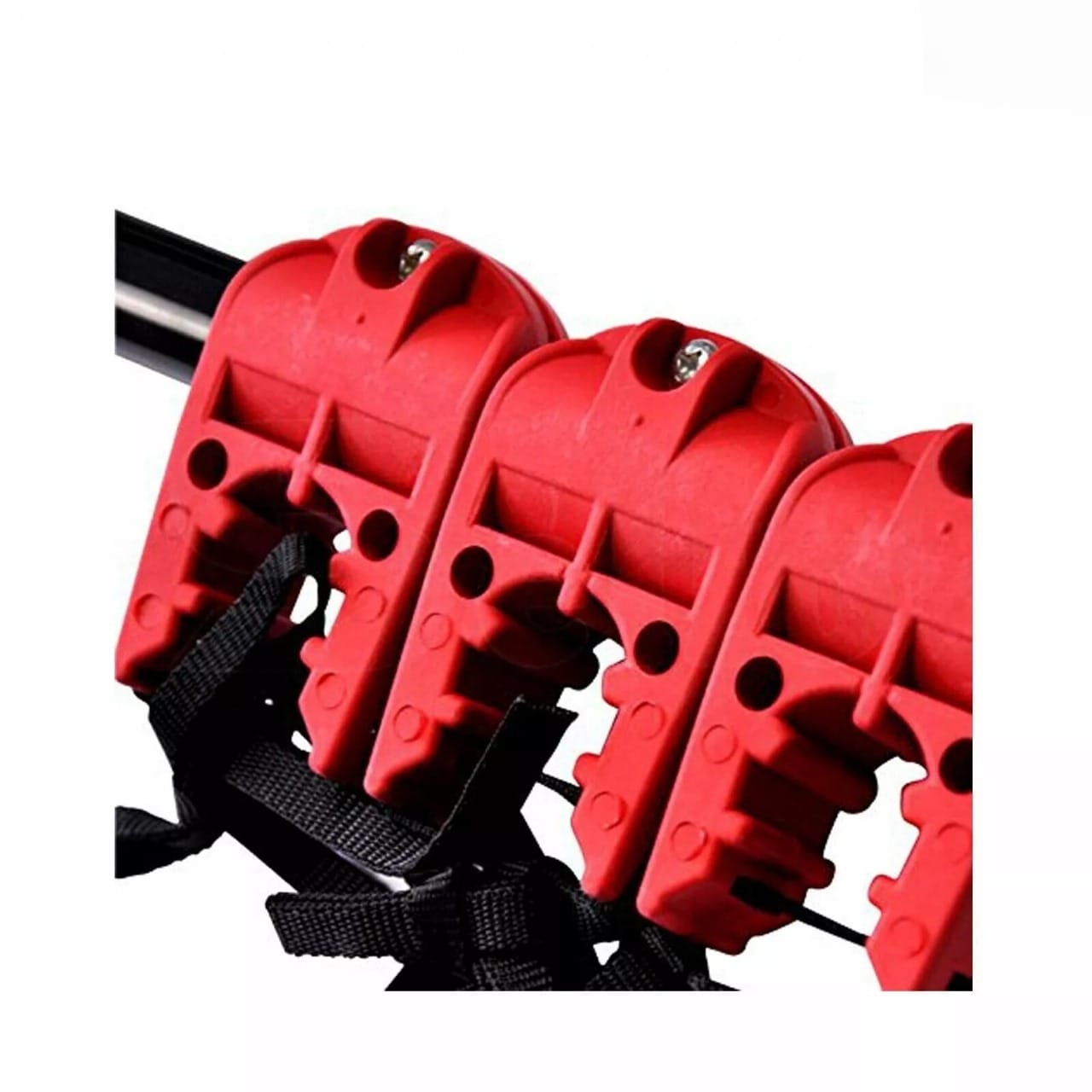 This high-quality rear boot-mounted bike carrier is the perfect travel companion for cycling enthusiasts. Designed to hold one, two, or three bikes securely, it offers a strong yet lightweight steel frame construction with a sleek black finish and striking red mounts.